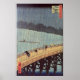 This Japanese color print was created by Ichiyusai Hiroshige in the 19th Century. The full name of the print is: "Evening Shower at Atake and the Great Bridge". This Japanese print is from the famous series: One Hundred Famous Views of Edo" (Meisho Yedo Hiakkei). In it we see a few Japanese workers crossing a large bridge, while a storm is raging, and a lot of rain is falling. They're covering themselves with straw hats, coats and perhaps umbrellas. In the background we also see a Japanese sailor on a canoe like boat crossing the river. The sky is quite dark because of the storm, and it's too dark to see the forests behind. The artist has also signed this artwork in Kanji characters and Hiragana (Japanese writing).