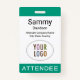 Personalize our professional attendee badge with your event logo, attendee name, and other custom text. It's pvc plastic and available with a lanyard, clip, or a retractable reel. Designed in emerald green and other colors with a modern minimalist design by MISOOK. All colors are customizable. You can optionally add other content to the back side (QR code, terms, etc). Easily customize the attendee title (VIP guest, visitor, speaker, etc). No minimum order quantity and no setup fee.