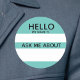 "Hello My Name Is" write on name tag with a second space for "Ask Me About". Event guest can write in their name and something about themselves for a conversation starter. Light teal background can be changed to any color you like, and all text can be edited. Great for reunions, networking events, parties.