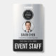 Modern event staff identification badge template featuring staff photo, name, role, and validity dates. Designed with a sleek metallic layout and clear “EVENT STAFF” designation, this professional credential ensures secure access, staff recognition, and organized event management. Perfect for conferences, concerts, corporate events, and logistics teams.