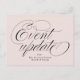 Need to cancel or postpone your event due to an unfortunate circumstances? Disasters like pandemics, severe weather, disease, death can deal a crushing blow to a big day. Send a notice to friends, family and associates with this simple and tasteful postcard. The back includes a large block of custom text with suggested wording. There is also room for you to sign it. The blush aolor scheme can be edited by clicking "customize further." Also works for other events that need to be postponed like graduation parties, proms, fundraisers, galas, family reunions and more.