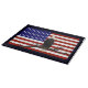 A Bald Eagle scans the sky from his perch on a tree branch; superimposed on a flag of the United States.
