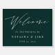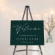 Welcome guests to your wedding with this elegant sign featuring white typography on a dark forest green background with "welcome" at the top in elegant handwritten calligraphy script. Personalize with your names and wedding date beneath.