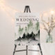 Elements: watercolor mountain scene with elegant, contemporary serif fonts. Colors: green, hunter green, highland green, white, white mist, gray, slate. Themes: modern, outdoor wedding, mountains, rustic, woodsy, outdoorsy, forest, woodland, nature, hiking, rocky mountains, sierra nevadas, blue ridge mountains, smokey mountains. Collection: Evergreen Mountain Mist Rustic Winter Wedding Collection. Product Type: Welcome Sign