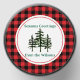 This design starts with a red and black check pattern. In the center, there's a white circle with three evergreen trees. There's an area for you to add your personalized message.