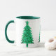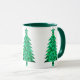 Mug in a classic silhouette of a Christmas tree in dark pine green / evergreen, patterned with geometric snowflakes in pastel green, aqua and ice blue
