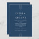 This double sided wedding invitation from the Everly Collection features a refined art deco design in deep navy blue with crisp white typography and elegant line accents. The editorial layout and geometric details set a classic, modern, retro mood.