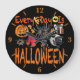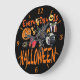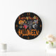 Large Round Wall Art Clock and home furnishing decor accessory with Everyday Is Halloween original artwork design illustration by TheFabricSeal highlights together in this cute collage some of our favorite design artworks for Halloween including pumpkins, ghost, fairy, the invisible man, Frankenstein, vampire, fairies, bats, spiders and candy corn. Goth, gothic, victorian, elegant, fun, fully, silly, humor, humorous. Scare, scary, scared, fright, frightening, ghoulish, creepy, spooky. Party, celebrate, celebration, festive, partying, trick or treat, treats, candy.
