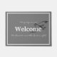 Plush door mat is shown in gray and has a white border and text. Text reads " Every day we rise," " Welcome" in bold print in center and " we choose to serve the Lord our GOD". Outlined image of a dove behind the word 'Welcome'.