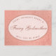 On a rose gold background, there is a white transparent oval with with text in it. The words "Fairy Godmother" are written in an elegant calligraphic script, the rest in smaller curved caps up and down . On the back, there is a message and an address. The message on the back is written in the same handwriting script. All text has a red-brown color similar to the rose gold background.