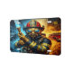 This custom License Plate features A firefighter in a golden gas mask holds a water hose, standing in front of a fire.