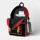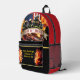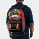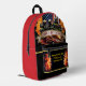 This custom First Responders Firefighters Backpack features Four firefighters in full gear stand in front of an American flag with flames surrounding them, holding a hose towards a burning car. symbolizing bravery and heroism,