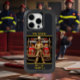 This custom IPHONE 15 features A golden firefighter stands in front of a red fire truck with flames in the background. symbolizing bravery and heroism,