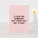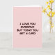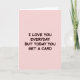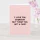 This card features a soft blush-pink background with a single centered message that feels like a teasing nudge between close partners or best friends ❤️. The words read, “I LOVE YOU EVERYDAY BUT TODAY YOU GET A CARD,” giving the impression of someone who shows care daily but still enjoys marking the moment with something tangible. The lettering is thick, rounded, and easy to read, adding a friendly, affectionate tone without any extra decoration. All the text is set in uppercase and placed in the middle of the design, so the message lands immediately. The color of the letters is a rich reddish-brown that stands out gently against the pale pink, keeping the look calm and tender. There are no characters or extra objects, which makes the empty space around the words feel like a quiet pause before a hug 🌼. The lighting is even with no shadows, and the only visible elements are the centered reddish-brown text on the uniform blush-pink field.