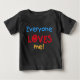 A cute, fun, colorful text design on T-shirts, bodysuits, raglan T-shirts, hats, sleeveless dresses, ruffle shirts and dresses, organic bodysuits, sweatshirts, pullover hoodies, dark T-shirts, and other apparel that reads Everyone Loves Me with text of blue, red, and gold.