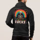 Wrap yourself in ironic comfort with this hoodie that perfectly blends dark humor and vibrant style. Featuring a chill skeleton beneath a bright rainbow, this hoodie says “everything sucks” — but you’re still showing up, staying warm, and looking cool.