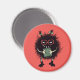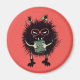 Book lover magnet with a funny vector illustration of an evil hairy creature with ponytails and eyeglasses holding a book and grinning with its sharp teeth.