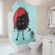 Funny evil Christmas shower curtain with a black cartoon grinning bug unpacking a Christmas present. This evil bug shower curtain will add some fun to your Christmas decor.