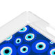Colourful tray printed with a bold blue and white contemporary Greek Eye pattern. The Evil Eye design was believed to ward off the evil gaze of others. In modern times, it is believed to be a lucky charm, talisman, and protector from evil.