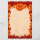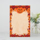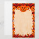 Carved pumpkin jack-o-lantern with fanged grin and two glowing red eyes. Halloween themed design. Blank stationery paper with a stylized flame border.