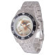 Has heft and feel of expensive stainless steel quartz watches. Good band with safety catch. I removed links, which is easy because engraved arrows show direction to push the linking pins. As always by this seller, the image (a railroad logo) is a perfect reproduction of my emailed image, and is precisely spaced and aligned.