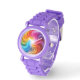 I only have one complaint. I ordered the watch with clear case and strap, and what was sent was white case and strap. I'm going to keep it because 1) it looks very nice in white, and 2) it would take too long to get a replacement made and sent in time for my occasion. Aside from the mix up with the color, the watch does look very good in white. The purple dial is actually sparkly which did not show in the online images. That was a nice surprise. If you like Swatch watches this is very similar to those. It's 33.6mm in diameter, 10.5mm thick, and 40.6mm lug to lug. Stainless steel case back says 3ATM/30m WR, so no swimming or showering or submerging this one. If you like Woodstock, this is a great choice.