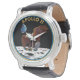 This watch features the mission patch from Apollo 11, the first manned lunar landing flight in July, 1969. The eagle is of course a symbol of the United States and was also the call sign chosen for the lunar module. Clasped in the eagle's talons is an olive branch, a symbol of peace. During the first EVA the astronauts read from a plaque they would leave behind, "We came in peace for all mankind."