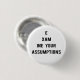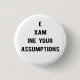 Remind yourself to challenge your assumptions or warn others that things aren't always what they seem with this button featuring the slogan "Examine your assumptions."