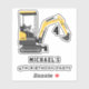 Perfect theme birthday party sticker for kids who love construction vehicles. Add a name, and party details by clicking the "Personalize" button. Features an excavator in yellow and dark gray vivid colors.