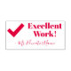 This motivating rubber stamp design features the inspiring feedback message "Excellent Work!" and a personalized tutor's name. It also features a decorative check mark icon. It could be used by a school teacher, educator, instructor, or tutor when grading student work, to acknowledge that a student has done an exceptional job.