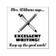 Teacher says excellent writing custom creative arts teacher encouragement pre inked stamp. Fun personalized teacher stamp decorated with a pen and pencil illustration. Customize it by editing the sample name and praise and encouragement custom text.