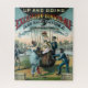 Circa 1885 - Advertisement for Ginger Ale with balloon and basket with black attendants. Two women drink Excelsior Ginger Ale, implying the carbonation helps the balloon to rise. Image of two fashionably dressed women in slim long dresses and bonnets embarking on a hot air balloon ride, one stands inside the basket holding a lace-edged handkerchief with a mustached balloon operator with binoculars and a monocle, the other sips ginger ale from a glass as she begins to ascend a rope ladder into the craft; two African-American men with ginger ale bottles attend the balloon; a large crowd of people watches the spectacle from stands behind a white wood fence painted with advertising slogans