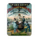 Circa 1885 - Advertisement for Ginger Ale with balloon and basket with black attendants. Two women drink Excelsior Ginger Ale, implying the carbonation helps the balloon to rise. Image of two fashionably dressed women in slim long dresses and bonnets embarking on a hot air balloon ride, one stands inside the basket holding a lace-edged handkerchief with a mustached balloon operator with binoculars and a monocle, the other sips ginger ale from a glass as she begins to ascend a rope ladder into the craft; two African-American men with ginger ale bottles attend the balloon; a large crowd of people watches the spectacle from stands behind a white wood fence painted with advertising slogans