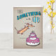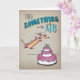 Silly Dachshund is super-excited about celebrating someone's birthday! Cartoon is hand drawn with colored pencils and ink, before being scanned into digital format. Dachshund is leaping into a giant, triple layered birthday cake. Decorative text reads "There's something in the air". Full color on a faux brown paper background.
