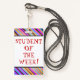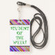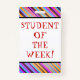 This exciting, positive badge design features the message "STUDENT OF THE WEEK!". A badge like this might be used to help encourage a student. [~Z0000317]