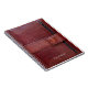 The notebook cover features the effect of a worn brown leather bound personal information manager on the cover and the image shows a strap and clasp to secure the contents. Note that the design is a digitally printed flat image on the cover and no leather is used.