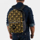 This fun backpack features a delightful boho style pattern of a playful gold giraffe. Included in the pattern with the giraffe are a butterfly and various floral elements, along with symbols. The pattern is placed on a dramatic black background. Your triple letter monogram is in gold within a black circle banner at the center of the pocket.