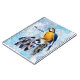 A dream catcher that includes the round circle of bamboo and red beads in the web with blue exotic-parrot bird tone feathers on a soft blues feather background wedding theme