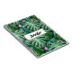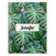 Personalized spiral notebook made with an image of big leafy lush green tropical leaves with a splash of pink behind. Painted with acrylics and digitized. A white frame with a faux gold foil border layered over top with your name written inside.