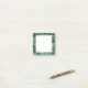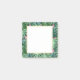 Small square post-it notes made with an image of big leafy lush green tropical leaves with a splash of pink behind. Painted with acrylics and digitized. A white frame with a faux gold foil border layered over top