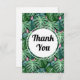 A wedding (or other occasion) flat thank you card. Summery feel with a background pattern of exotic tropical philodendron leaves in green. Hand painted digital image. A hint of pink in the background. message on the back can be changed/personalized or left as is.