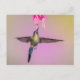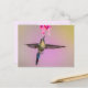 Postcard featuring the exotic violet-tailed sylph hummingbird in flight in a cloud forest in Ecuador, reaching for a pink fuchsia flower, with it wings outstretched and beautiful long tail feathers on display. Beautiful and unique hummingbird card for bird, nature and garden lovers. Photo taken at Tandayapa, Ecuador.