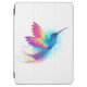 Bright, iridescent, exotic flying hummingbird on white background, painted over with multicolor, watercolor paint. Rainbow hummingbird.