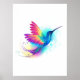Bright, iridescent, exotic flying hummingbird on white background, painted over with multicolor, watercolor paint. Rainbow hummingbird.