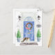 Announce your new address with our stylish announcement featuring a Exotic Shorthair cat, blue front door, welcome mat, slate sign, topiaries and a floral wreath set on a gray brick background.