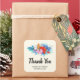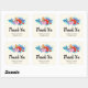 Party thank you stickers with a vibrant and beautiful tropical flower bouquet. Orchids, hibiscus and tropical leaves. Pink, turquoise, red and blue colors.