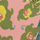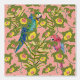 Hand drawn watercolor parrots in primary colors with ferns and vines of flowers on a salmon pink background.