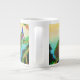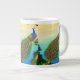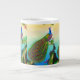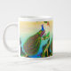 Original repeat design of colorful Indian peacocks by artist Carolyn McFann of Two Purring Cats Studio printed on a dishwasher and microwave safe, jumbo-sized mug for all who love wild birds.