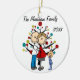 A pretty round ceramic keepsake Christmas holiday ornament features a stick figure expectant couple and young son in front of a decorated Christmas tree with areas you can customize with your family name and the current year! This cute holiday keepsake ornament makes a great gift for the young family to commemorate a special year!