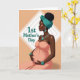 This design shows an expectant mother in side profile against a warm peach background, her posture calm and affectionate as her hands rest gently on her belly ❤️. She wears a strapless, flowing coral dress with soft folds that follow her shape, adding a romantic, tender mood to the scene. A teal headwrap is tied neatly above her forehead and gathers into a dark puff at the back, coordinating with her jewelry. Large teardrop earrings, a double-strand beaded necklace with a centered pendant, and ribbed bracelets repeat the same teal tone, creating a friendly, harmonious contrast with her glowing skin. To her left, the words “1st Mother’s Day” appear in teal lettering, arranged inside a thin geometric outline in a lighter shade. Subtle highlights along her cheekbone and collarbone suggest gentle light, like a quiet moment shared with someone close 🌼. The geometric frame sits slightly behind the text, with the peach background remaining smooth and uncluttered.